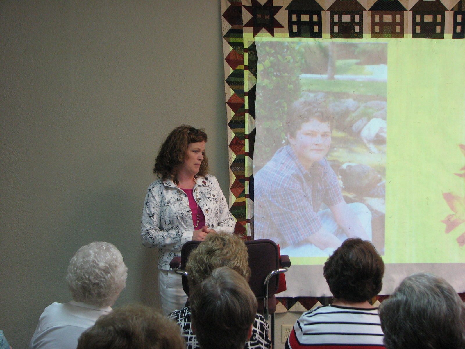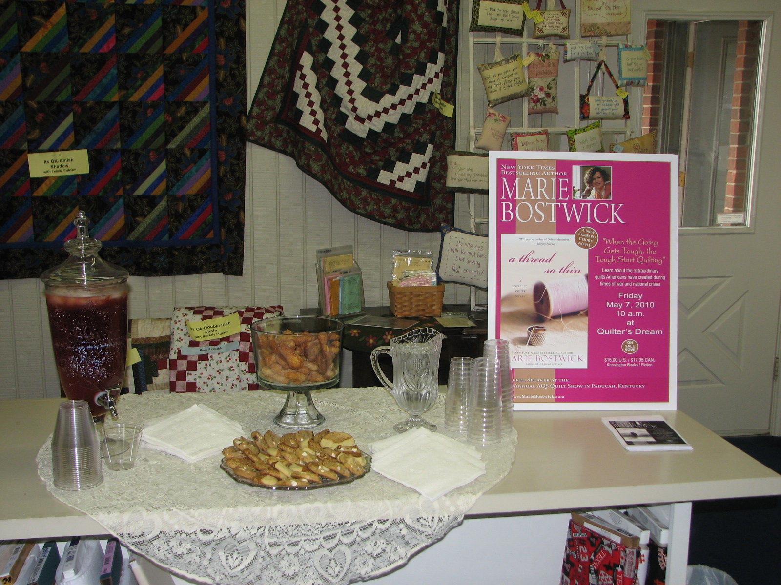 Look at the pretty table of goodies that Beverly had set up for the special occasion. Marie was impressed! She said we were way more fun than Barnes and Noble (sorry B&N!) And I got her permission to give you just a brief video clip of her program – which she also does at guilds and other quilting events. In fact, she had just come from Paducah! You can read a whole lot more about Marie at her website and register as a reading friend – I just did that and it looks like a fun site! She even has a blog! Well, of course, she does, silly Barb – she’s a writer, after all!