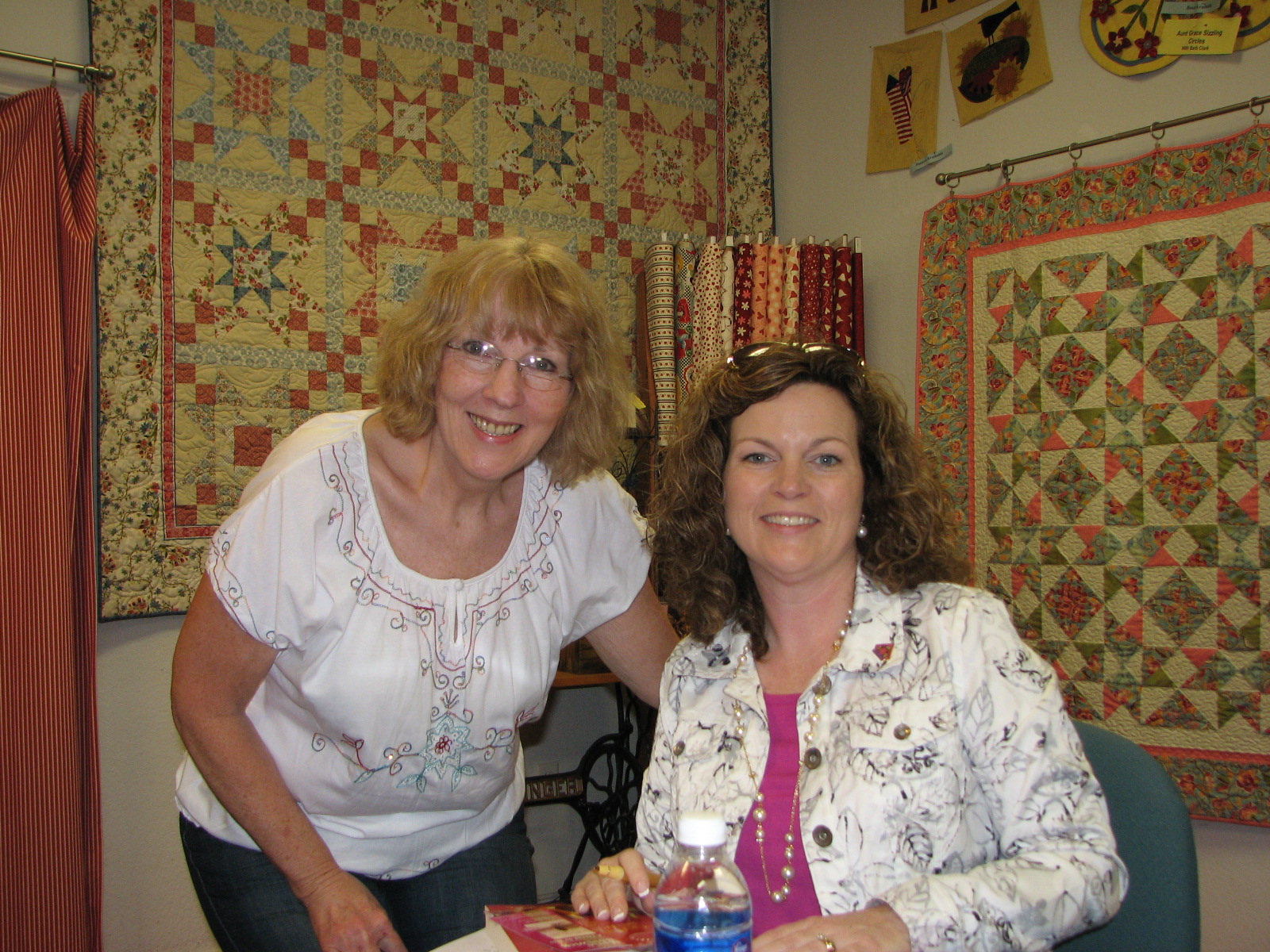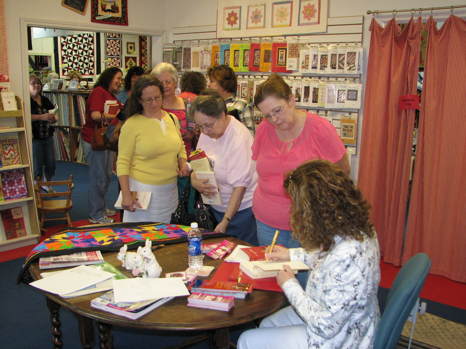 Marie chatting with new friends while she’s signing books. The bright hunter star table runner on the table is one she brought along to show. Cool quilt, Marie!