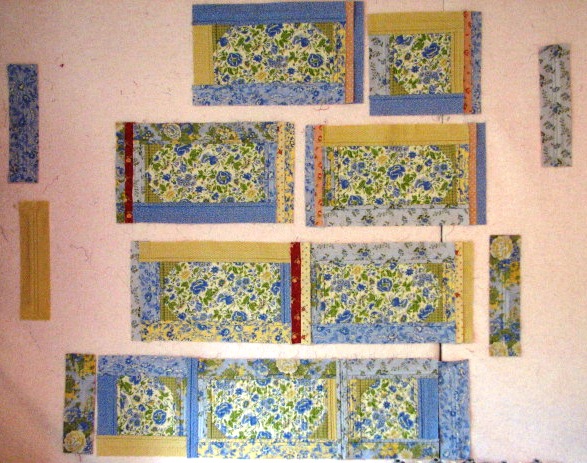 There’s always one piece left under the sewing machine.  I like to chain piece all the time.  It saves thread.  And there’s a LOT of thread in this project!  It makes for good exercise too, as I try to keep all the pieces in their rightful places on the design wall.  Up Down Up Down – all day long.  (Kinda like the people on the bus – remember that song from childhood?  The people on the bus go up and down, up and down, up and down…..  If I knew how to surround this with musical notes, I’d do it for ya!  Now you’re gonna be singing that one for the rest of the day.  You can thank me later.)