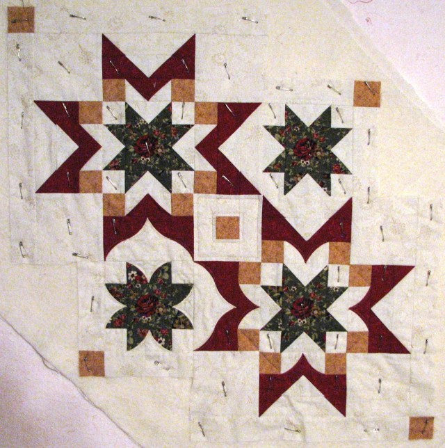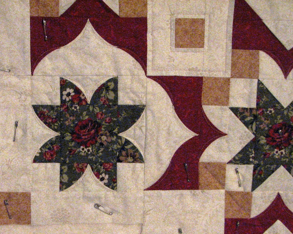 See how those stars are starting to take on some curves?  The green star on the lower left has curves and also some of the red pieces – added in the quilting process.  Isn’t that the coolest?  Here’s a close up for you to see better…..