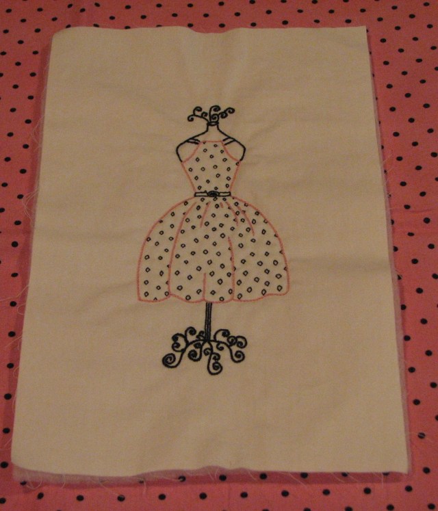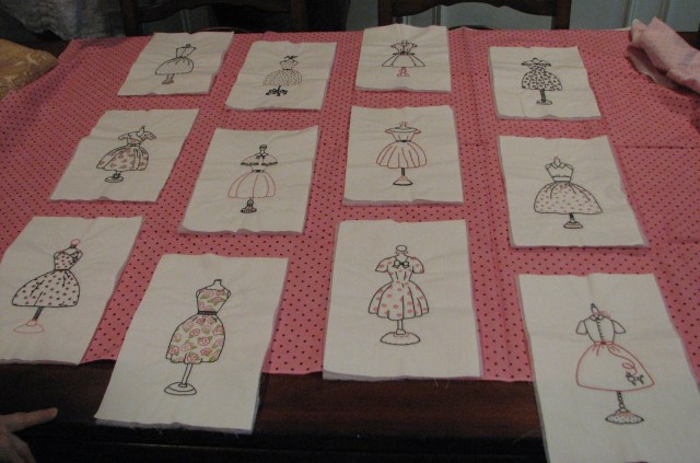How about Susan’s sweet, intricate, fabulous, beautiful – OK I don’t have enough adjectives – embroidered 50’s dress blocks!  And she had loads of help with ideas for how to put them together.  Get busy, Susan!  We want to see this one completed by the next Bee, don’t we?  But you need to see some of them up close and personal.