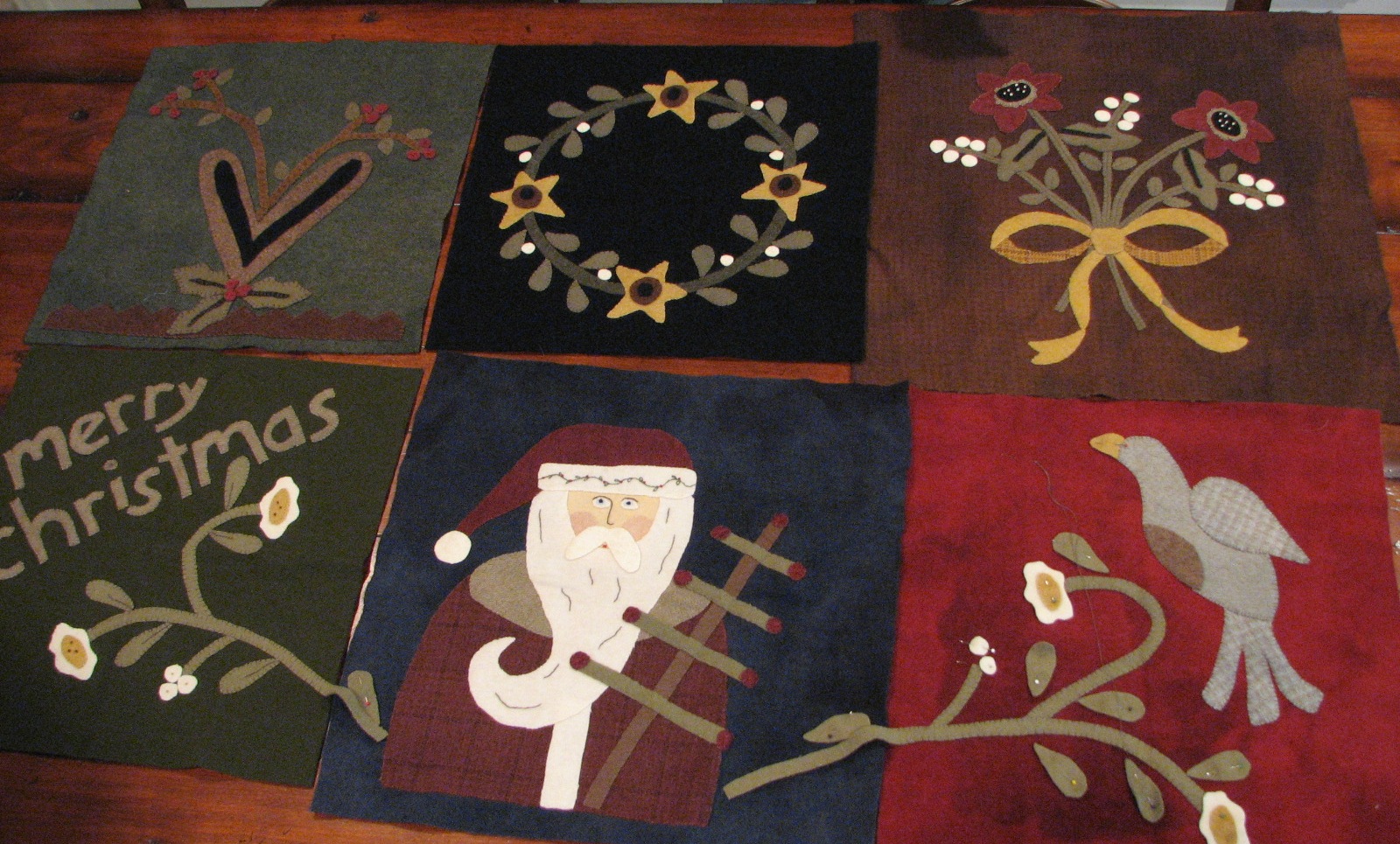 These are Cindy’s wool blocks.  We have a lot of diversity in quilting in our group!  These blocks have sent Susan on a frenzy of looking for wool projects now.  I think Cindy must be in cahoots with the wool industry.  She ought to get commission for all the business she sent them with just Susan this week.  She really went crazy.  I mean really.  Just ask her!  She’ll tell you.  Go ahead and tell them how crazy you went, Susan.
