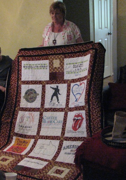 Sue H made a cool T-shirt quilt.  My niece wants me to make her one of these with her T-shirts.  In fact we are meeting tomorrow to buy fabric for her quilt!  She reads my blog even though she’s not a quilter and she blesses my heart.  “Hi, Janna!  See you soon!”