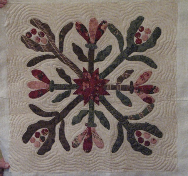 This little quilt is a joint effort by Sue H and me so far.  I did some of the applique and Sue completed that and quilted it.  I believe it’s going to be bound by someone else?  And then it will become a Silent Auction quilt for our guild Quilt Show in September!  We hope it makes lots of money for the guild!
