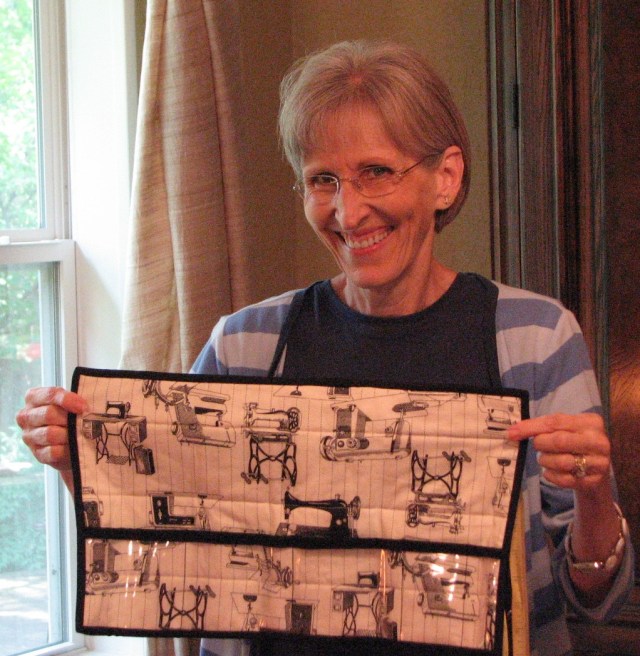 Judy also made this little tool pocket thingie – what do we call these things? – for her little Featherweight machine!  Cute fabric to use with the FW.  It holds your scissors and seam ripper and other sewing tools and sits under your sewing machine – with the tools all in the pockets hanging down in front.  Somehow I think I just lost you all in that description.  Maybe we need an action shot of it, Judy?  Next time…..