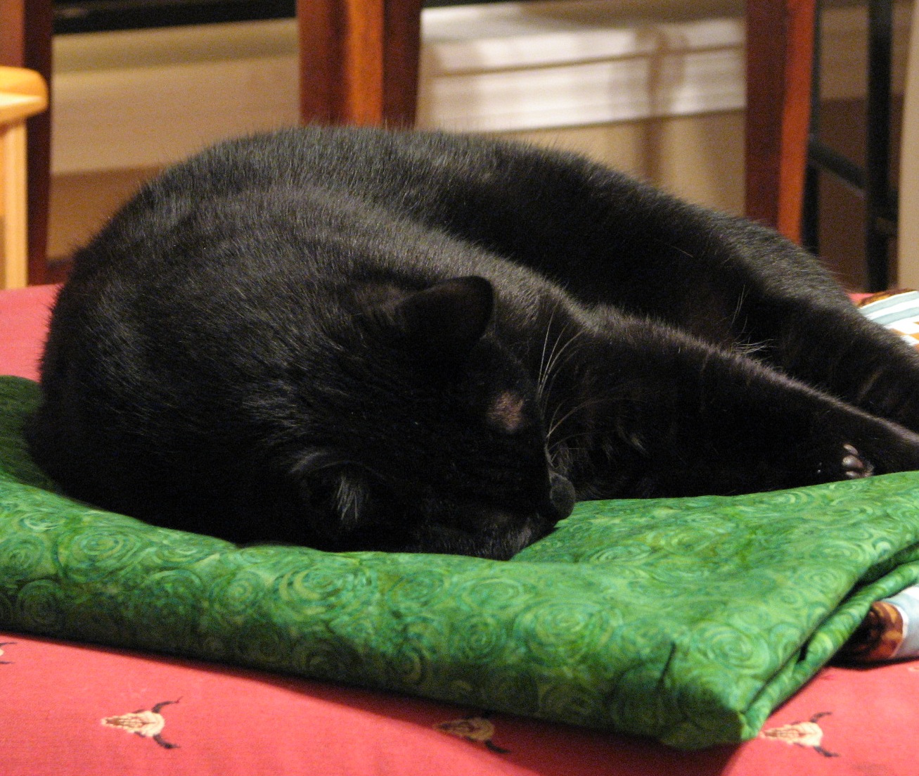 Boo had a job today too.  It was his job to hold down any fabric to keep the ceiling fan from blowing it around.  You can see here that he performed very well!  And he did this job all day today.  He is still, as I type, holding down this nice green batik backing fabric.  What a cat!  I can always count on him to do his job.  As long as the job I give him involves napping.