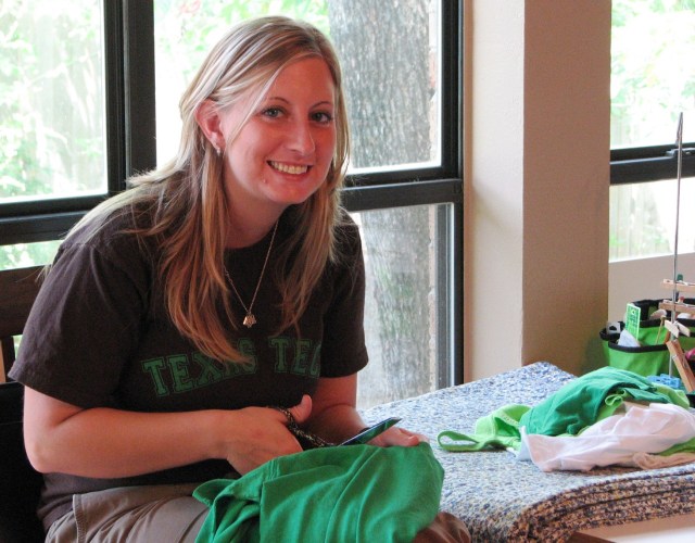 This is Janna.  She and I worked together to cut the sleeves and necks off the T-shirts as we began the work on this project together.  By the way – I should mention that we first went to the quilt shop for fabric and we had lunch together.  Janna bought my lunch.  She’s a very good niece.  Buying lunch for your quilter friends who you want to make you quilts could also win you brownie points.  Just something you might want to keep in mind.