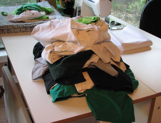 Janna and I did start with this BIG pile of T-shirts.  But we whittled it down to a much more manageable stack of nice T-shirt quilt blocks before the day was over.  And Janna took all the leftovers with her when she left so I didn’t end up with a new pile.  Thank you, Janna!