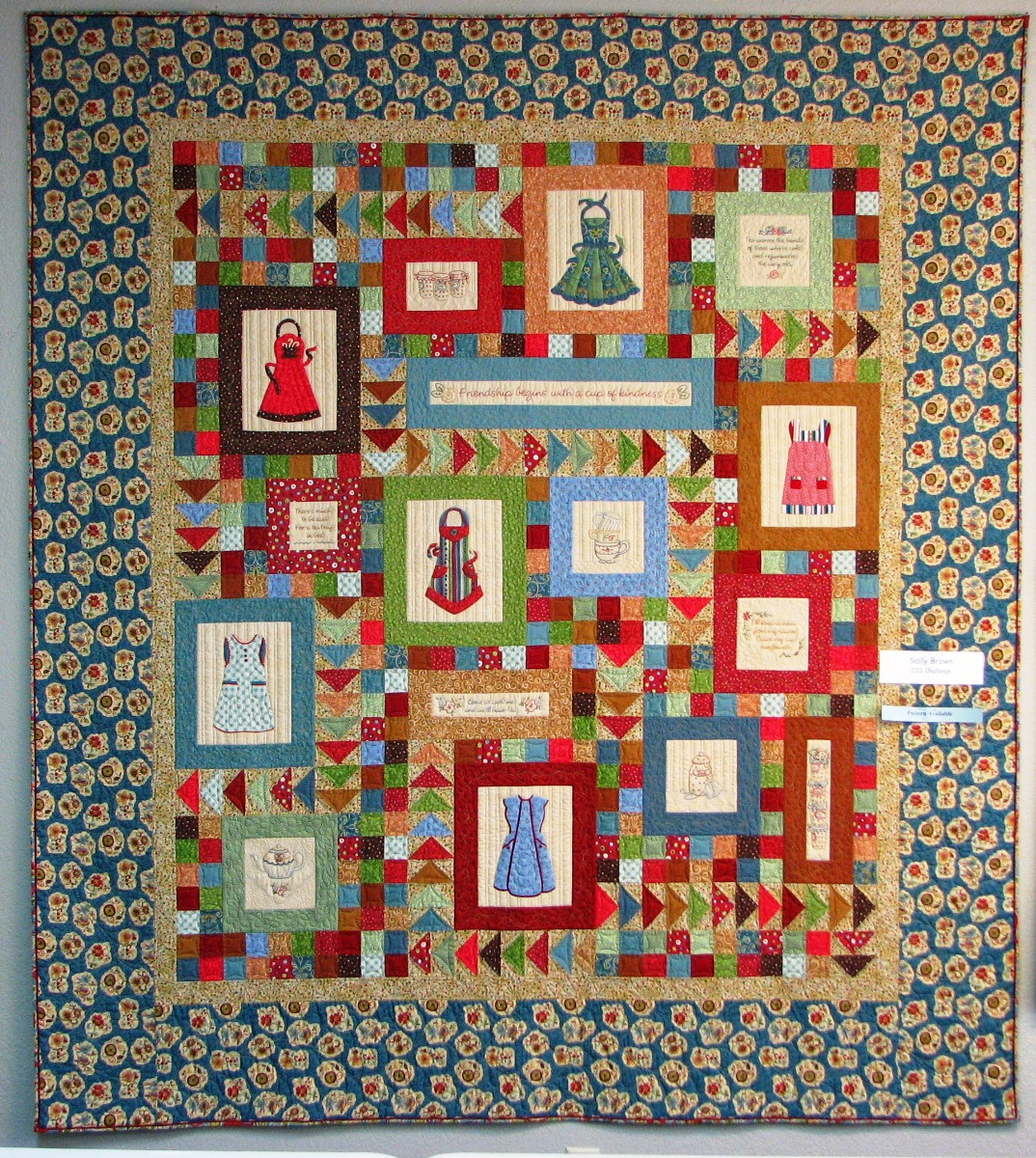And this is Sally’s quilt. She made up all these little aprons in her head. She is very talented. I’m hoping some of that rubs off on me too. Many of us encouraged her to make patterns from this quilt. We now have those patterns for sale in the shop. I think you could say I nagged her into it. She gave in so that I would stop bothering her about them. You will thank me when you see them. And Sally will thank me when she sells millions of them to all my blog friends who first heard about them here. I think she will owe me a commission, don’t you think? You can contact her at cloudpatch@sbcglobal.net – be sure to tell her you heard about it here first!