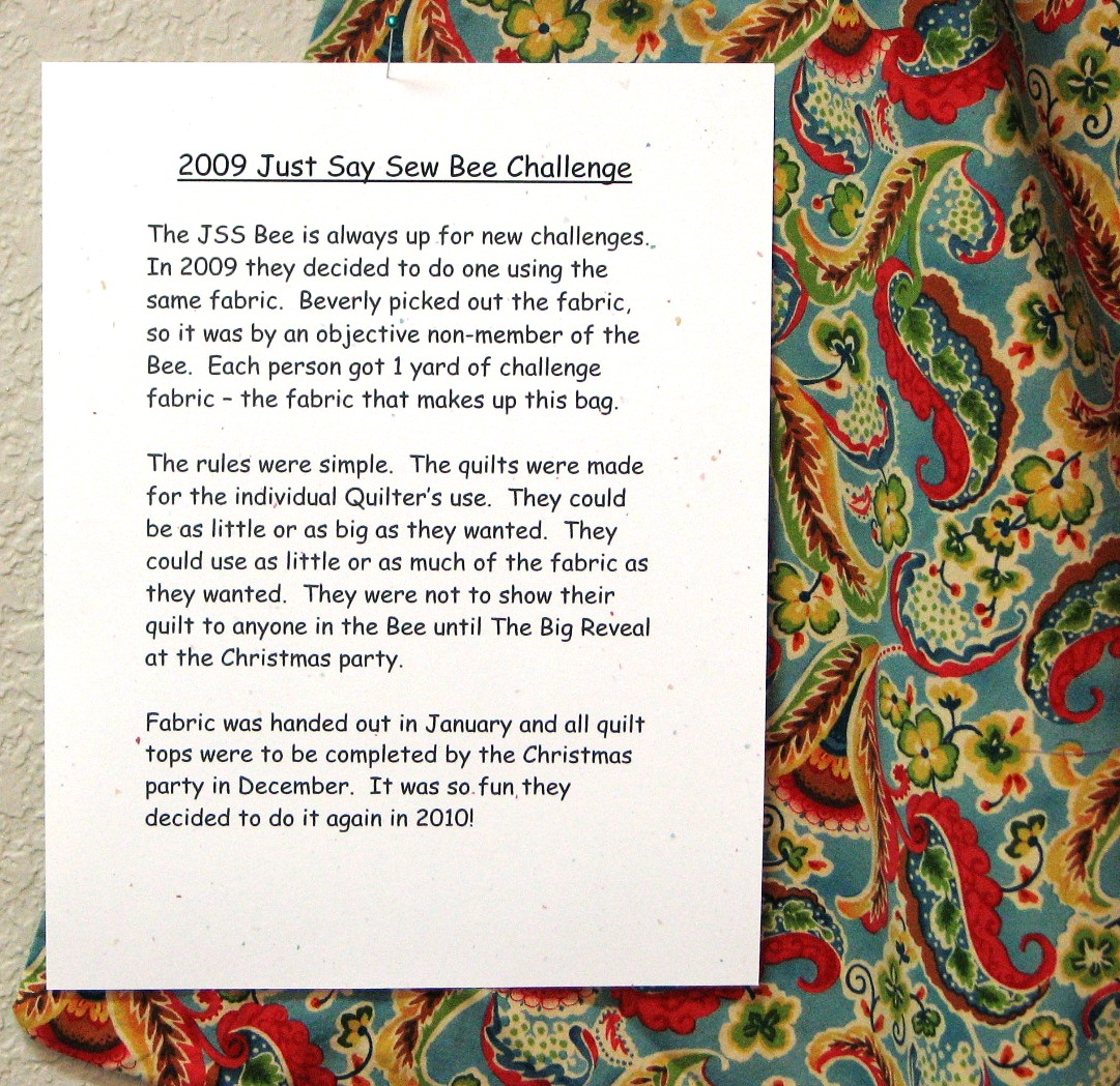 By the way – the only challenge fabric that Sally used was for the binding. Nowhere else in the whole quilt. She’s a rebel, that Sally girl…..