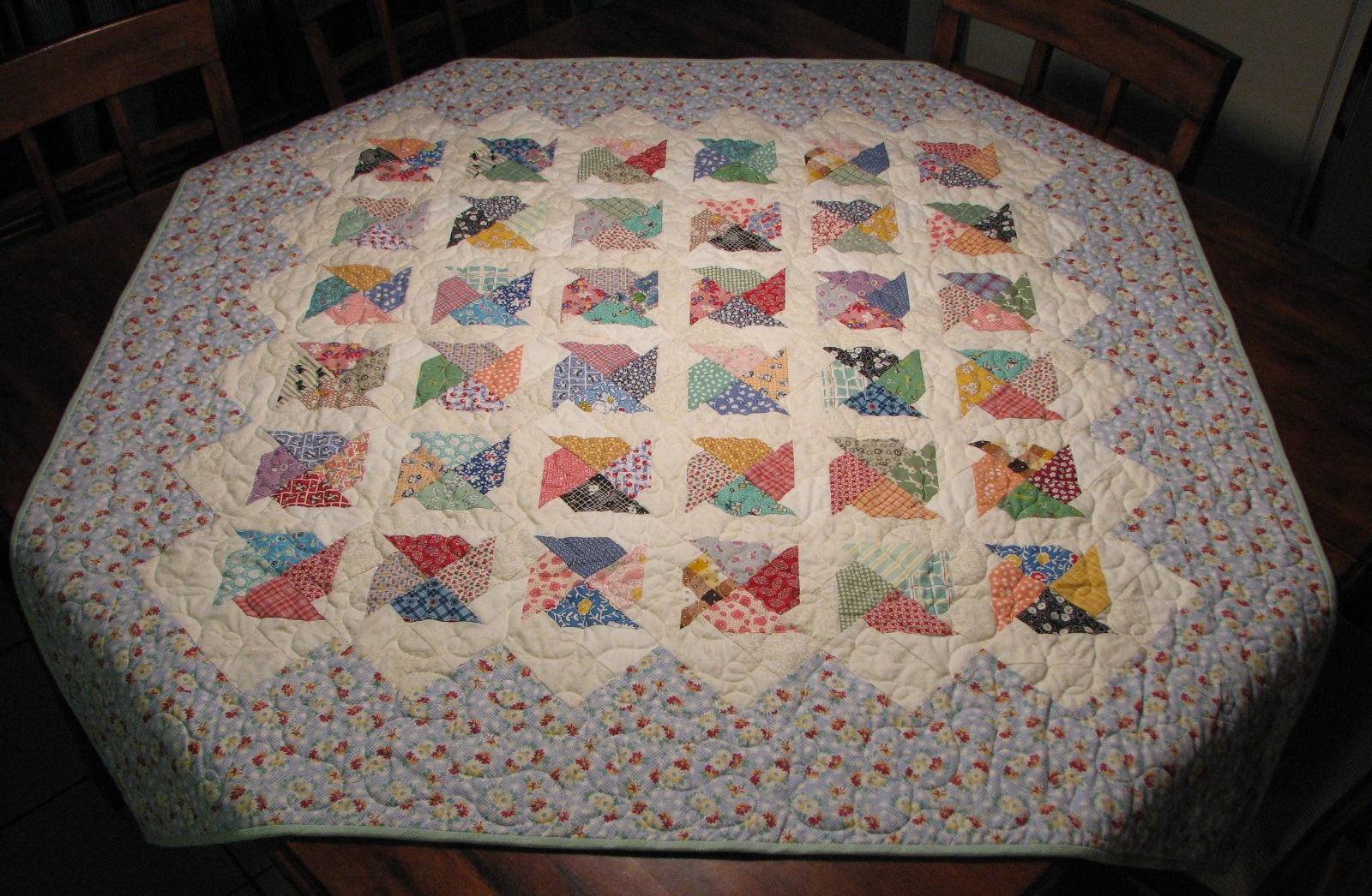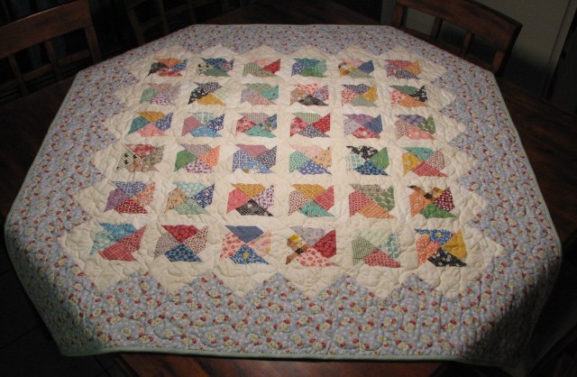 And this is my quilt that she quilted for me. Binding finished…..check! (I’m checking off the things on my list.) Doesn’t it look pretty for summer on my kitchen table?