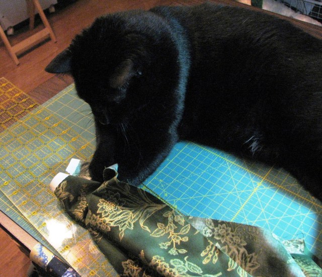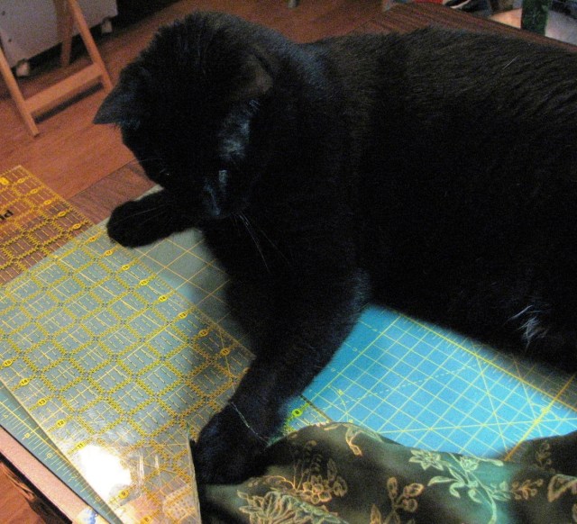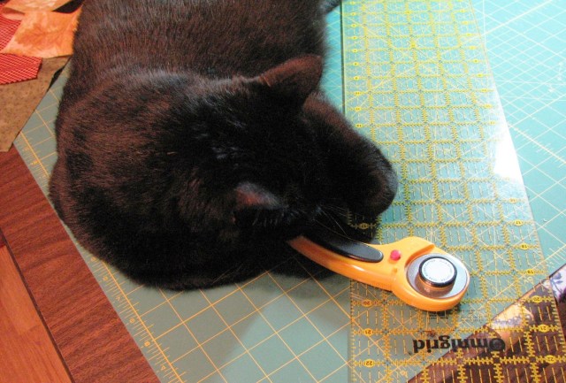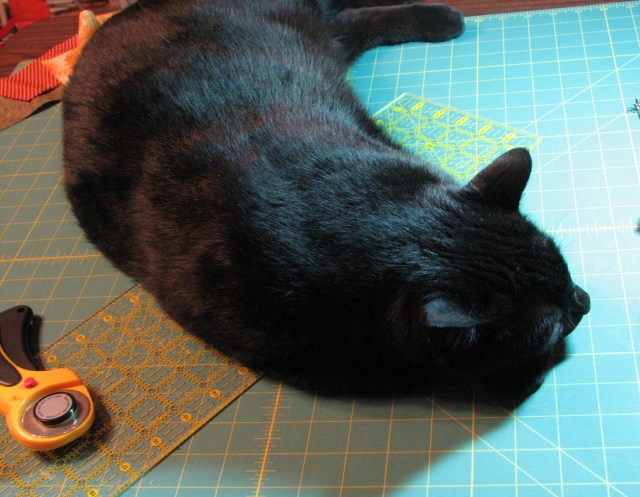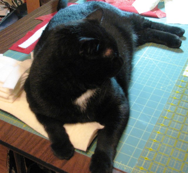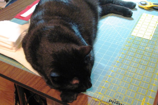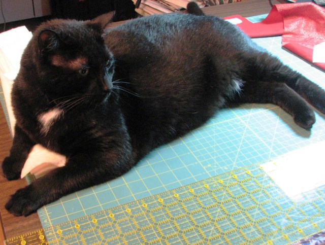 “Hi Mom! Oh, were you using the cutting table? I won’t be in the way. I’ll just stay over here on the side.” By the way, have I told you that Boo weighs about 16 pounds? He’s a very big cat. He takes up quite a bit of room on the cutting table.