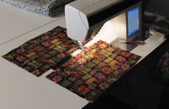 And here they are in progress! To show the steps to the class. Good thing I didn’t need to actually finish these for something this week. With all the extra help I was getting from Boo, that would have been impossible. They will get another round of scrappy Christmas fabric before they are finished and bound.