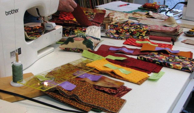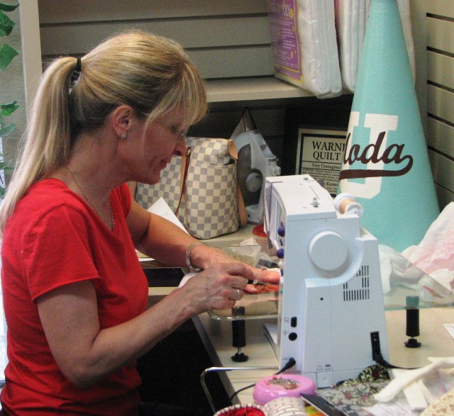 Look at her stitching away. She couldn’t even glance over and smile for the camera. She was head down, pedal to the metal all day long. (What does that mean anyway – “pedal to the metal?” Who invented that saying? One of you is in charge of googling that and getting back to me on where it originated and what it means.) And she thought she didn’t even want to take this class. She actually decided at the last possible minute that she wanted to learn this technique. And she got into the class by the skin of her teeth. (And why do we say that one? Do teeth have skin? I think not.)