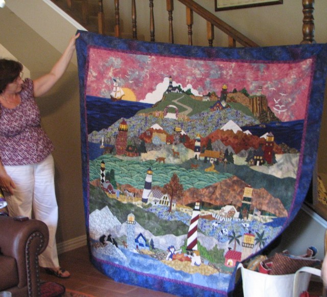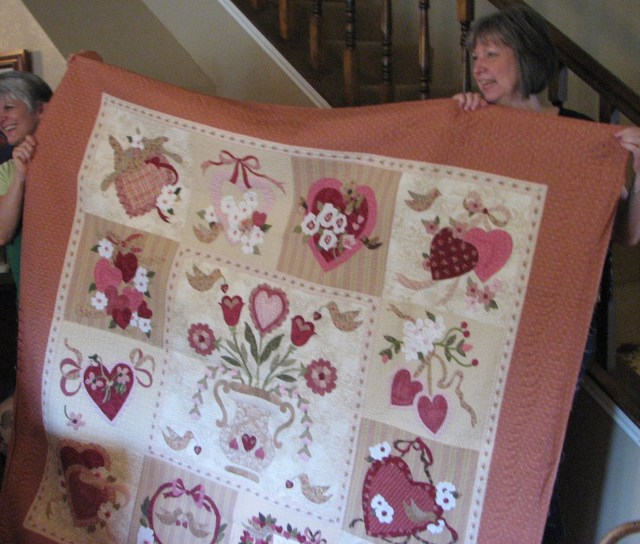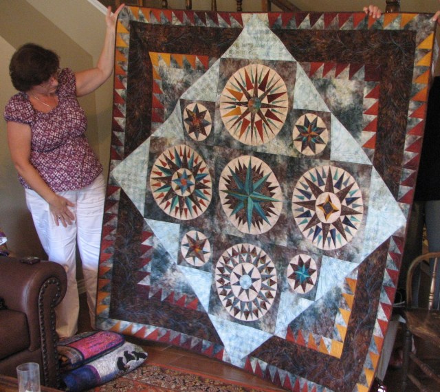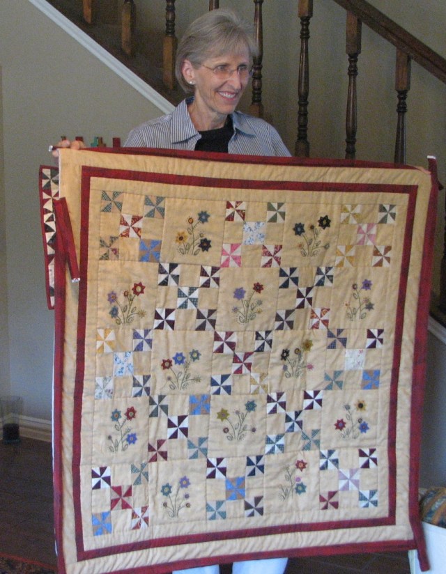 I also showed this one, but I didn’t make it. You’ve seen it before when Susan showed it. When I pulled it out this time, Susan said, “What’s that doing here?” I tried to convince everyone I had just whipped it up, but they weren’t buying it. (And I’m stitching the binding for my friend, Susan – that’s why I had it along.)