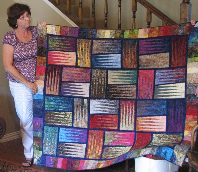 Karen started us off with this beautiful batik quilt that she just “threw together” AND had quilted (by Claudia) since last week! It’s made with blocks from the Saturday Sampler at Quilter’s Dream last year and she only used 6 of the 12. So she can make another quilt next week! That Karen is one fast stitcher….. and it turned out great!