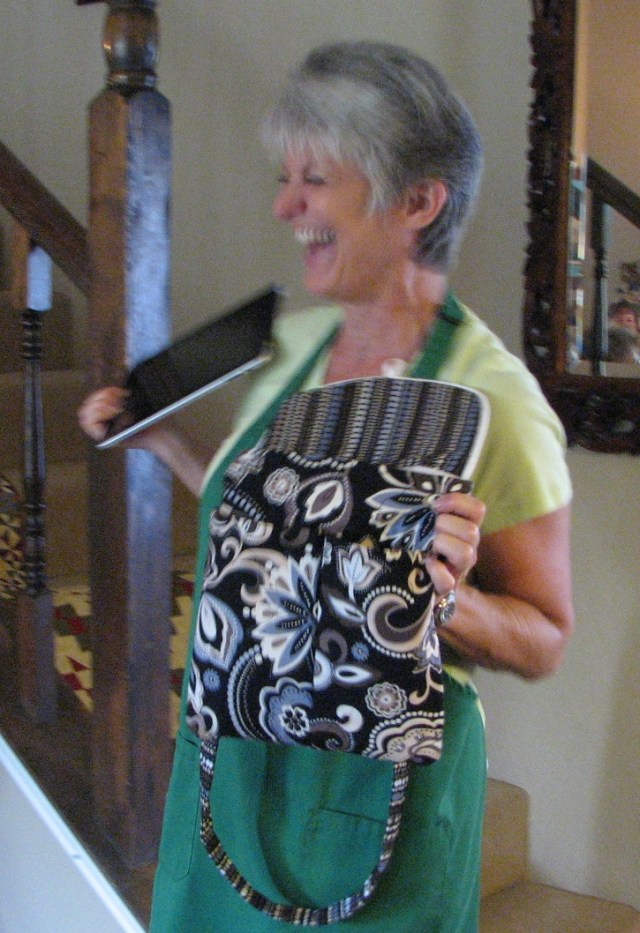 Tracie’s show ‘n tell was not a quilt (pay no attention to blurry Pam as she breezed by in the background. If I had photoshop, I’d brush her right out of the picture.)
