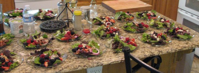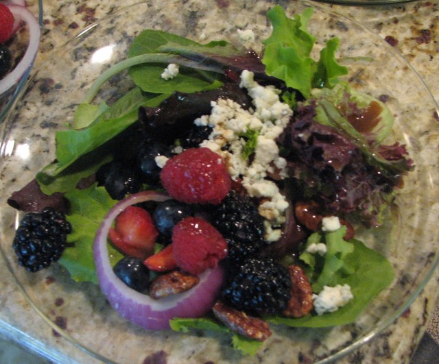 Beautiful and tasty salads with fresh berries, bleu cheese and a yummy balsamic dressing.