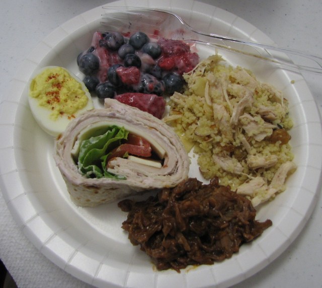 There were deviled eggs, fruit salad, tortilla roll ups, barbecue brisket and a chicken couscous dish.  And that was just on my plate!  And many, many desserts.  They got gobbled down so fast I didn’t even get a pic of the warm-from-the-oven peach cobbler with homemade ice cream and brownies and cookies and banana nut bread.  Oh, my!  I hope you’ve eaten before reading this today.  You ought to know by now that my posts aren’t safe to read on an empty stomach.