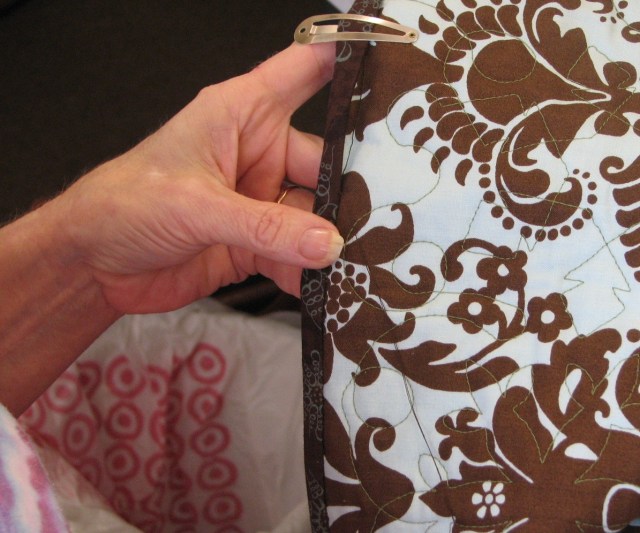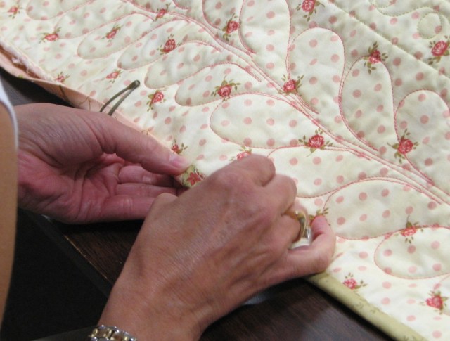 Judy L’s hands were a blur as she whipped the binding on her quilt.