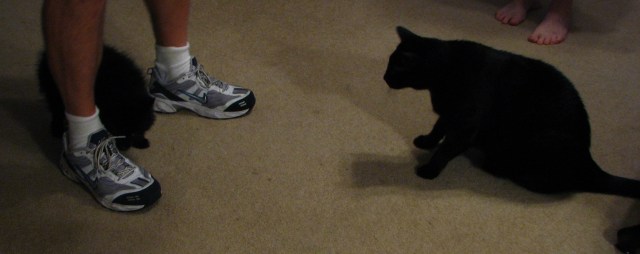 “Come on, Boo.  Let’s play!  I can take you on.  I know I can.”  Too bad that Boo outweighs Dixie by about 8 to 1.