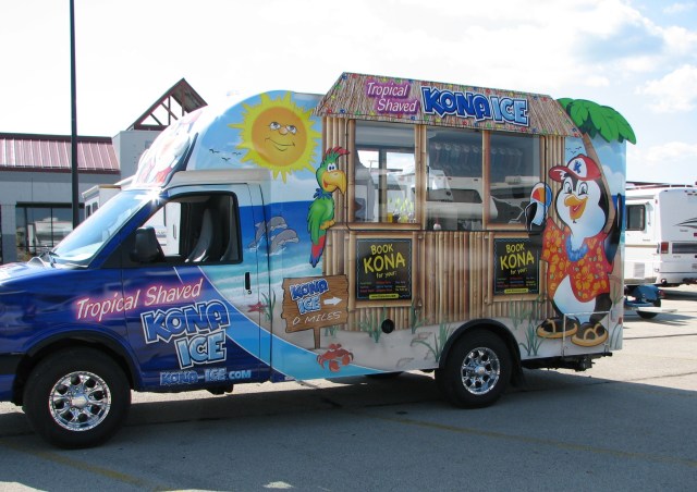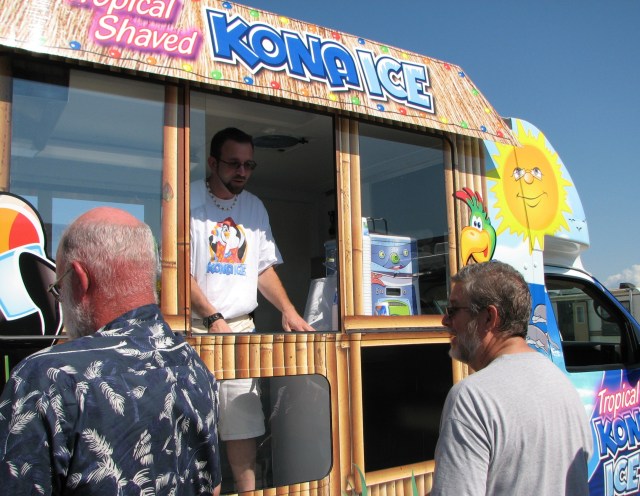Where you can add as much or as many flavors as you want.  Kona Ice-man assured us that he would be back again the next day.  And the next.  And we heard that Pizza Hut had been through our parking lot with coupons and offers for free delivery to RV’s.  The parking lot is looking better and better all the time.  We’re hanging out with the neighbors who say that the view from the roof of their RV is way better than at the official campground because you look right down the runway.  And the planes take off and land right over us.  We’re making lemonade out of lemons.  Turning adversity into something good.