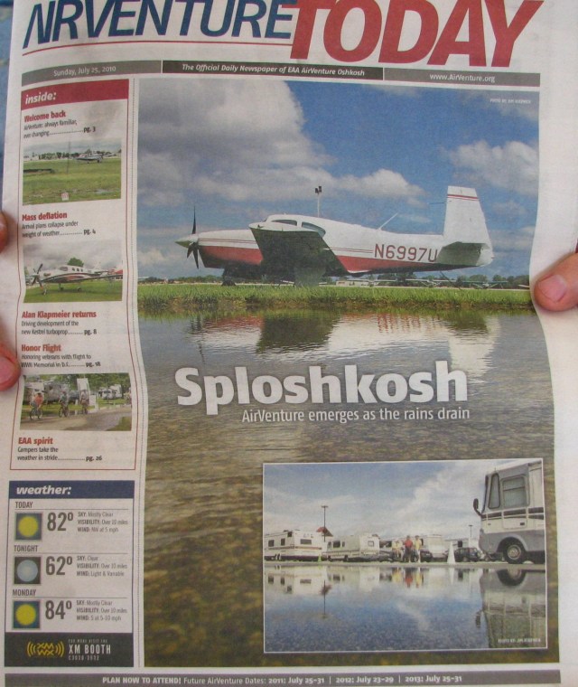 Can you say rain?  They had tons of it in Oshkosh, Wisconsin this month.  Broke records.  And just in time for the big EAA AirVenture Fly In.  And our arrival.  Can you say mud?  It made the headlines…..
