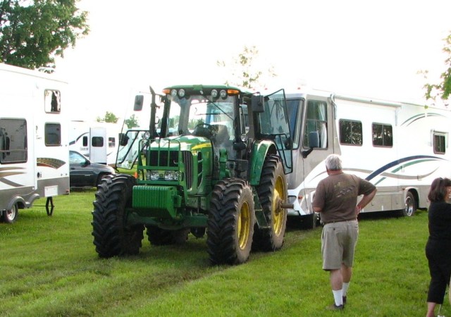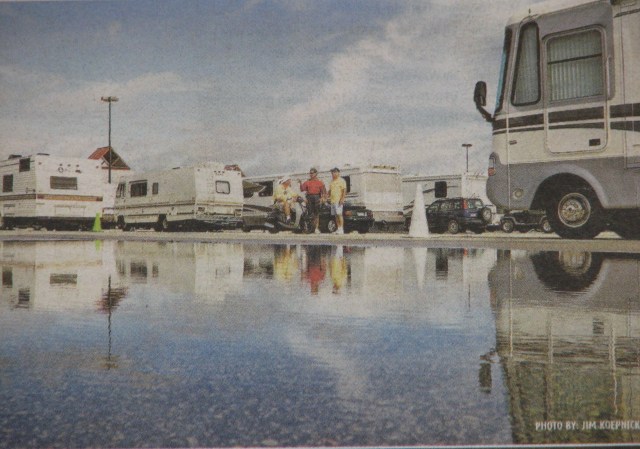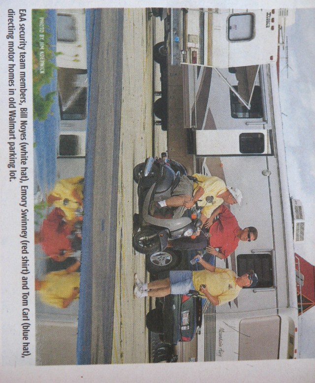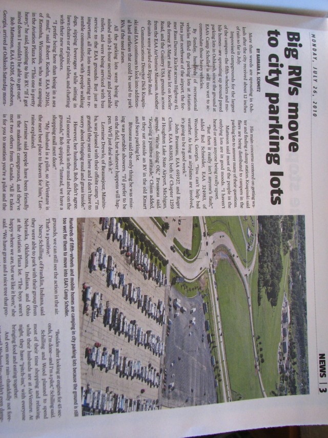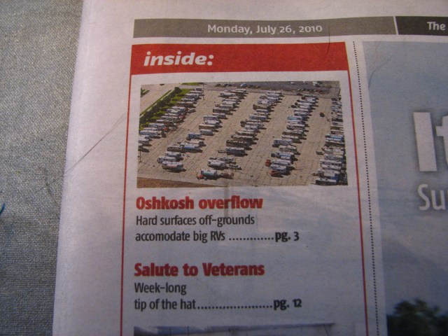 And so did we!  This is the AirVenture magazine that they publish each day of AirVenture.  And see that inset picture at the bottom of the front page?  That’s our motorhome in the background.  The third one from the left, right behind where those guys are standing.  And our blue CRV just to the right of our motorhome.  Cool, eh?  Front page news, that’s us!  And here’s an up close of that inset pic…..