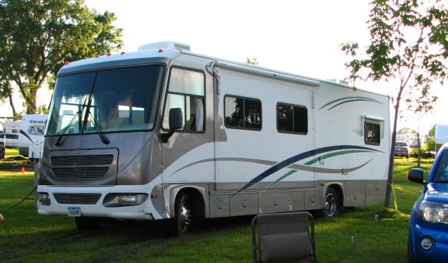 See the motorhome that says “Mountain Aire” on the back?  That’s ours.  And I think if you look really close, you can see me looking out the window of the slideout.  But you might have to get out your magnifying glass.  And use your imagination a bit.  But I know I’m in there.  Because the car is there.  And we took the car when we left on that day.  So we’re there.  And so is Boo.  We’re famous.  Cool, isn’t it?
