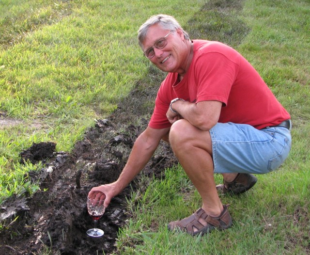 Our friend, Jerry, shows how deep the ruts are that she left behind.  He could bury his whole wine glass in the deep ruts.  And that was not a small wine glass either.  Most of the RVs that were in the campground were there before the rains came.  Jerry says he’s staying until he’s sure the ground is hard enough to pull out safely.  We think he might be staying until September.