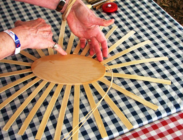 Ginger told us we would all whine with this next step.  We had to fold every other spoke piece up and over and trim the ones in between to be flush with the top. We didn’t whine at all!  And she even offered to serve cheese if we did.   Then it was time to add the rim pieces.