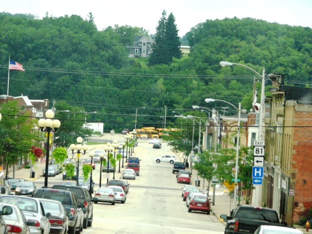 And then we came upon this cute little town.  There were big rolling hills in the southwest corner of Wisconsin.  And this town had its share of hills too.  Isn’t the little house at the end of the street cute?  High on a hill.  They have a pretty good view of downtown Main Street, don’t they?