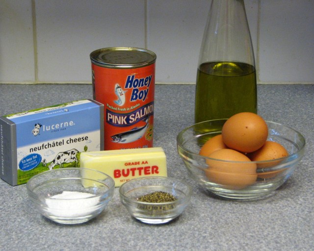 I probably should warn you right now.  If you can’t handle canned salmon then you probably shouldn’t read any further today.  Dear Hubby and I happen to love canned salmon.  And it is a good ingredient to have on hand to use in a pinch.  The rest of the ingredients are just eggs, butter, olive oil, cream cheese, salt and pepper.  Simple.  And very breakfasty.  Except perhaps the salmon?  But this is my take on a favorite of ours at Le Peep’s and it sounded good to me.