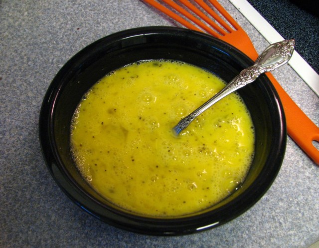 Then throw some of the salmon in the heated skillet and listen to the sizzle.  You actually just need to get the salmon heated a little.  I was taking pics and trying to stay ahead of what I was doing and my salmon got a little browned.  That was OK too!  While that’s sizzling a little, crack 4 eggs into a bowl and beat them together slightly with a fork.  I was just making dinner for two.  So I ended up only using about half the salmon.  We might have salmon patties for dinner tomorrow night!  And 4 eggs was plenty for just two people.  You could do more if you have more mouths to feed.