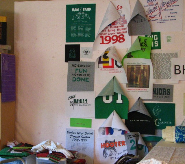 And I added the musical borders to this small piece from one dark shirt. Janna would love for me to finish her quilt in time for her birthday. It’s September 7th. She failed to mention which year. I think that’s my salvation. I really think I can finish it by 2011, Janna. I have a feeling she’s not laughing right now. But I have a big grin on my face. Ha!