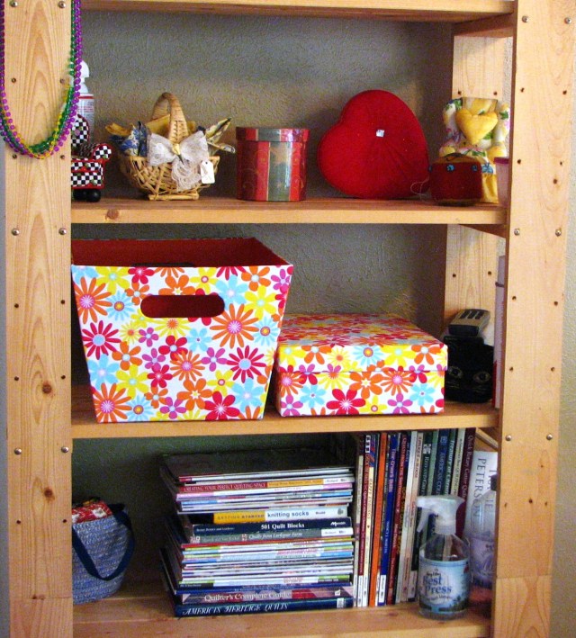 See how very organized my shelf unit looks now? And not only that, it’s pretty. I absolutely love the bright, happy bins!
