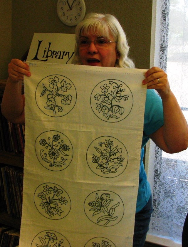 Jackie had two quilts to show us that she just got back from Libby, who did the quilting for her.  I didn’t get a pic of the second one because I got distracted.  But it’s the red & white one in the bag on the table.  They were great!