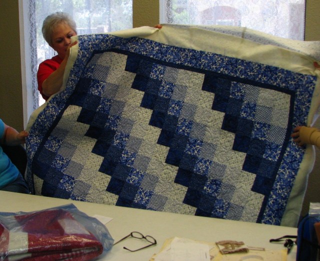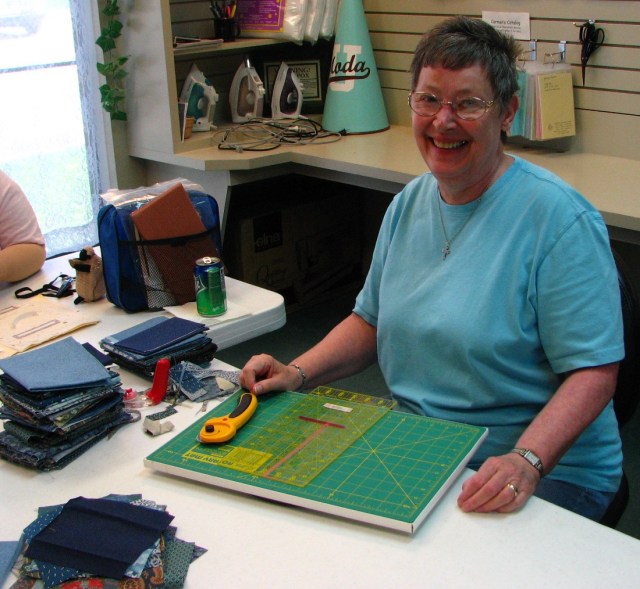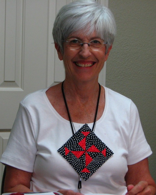 JoAnne wore all of her latest red, white and blue blocks on her shirt as her fashion accessory for the day.  Aren’t they the best?  JoAnne has completed 5,623 DJ quilts.  She’s so addicted she just can’t stop making these little blocks!