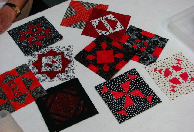 Charlotte had great news about a great gift from her sister.  Or maybe it was a not-so-great gift.  Great.  Not-so-great.  She was a bit conflicted.  We all thought it was great!  Her sister purchased DJ blocks from a block-of-the-month program and decided not to make the quilt so she gave all the blocks to Charlotte!  Who was feeling a bit overwhelmed at the project.  Praise the Lord she has a support group.  DJ requires a support group, you know.  Hang in there, Charlotte!  We’ll all help.  Help is a good thing.