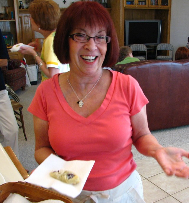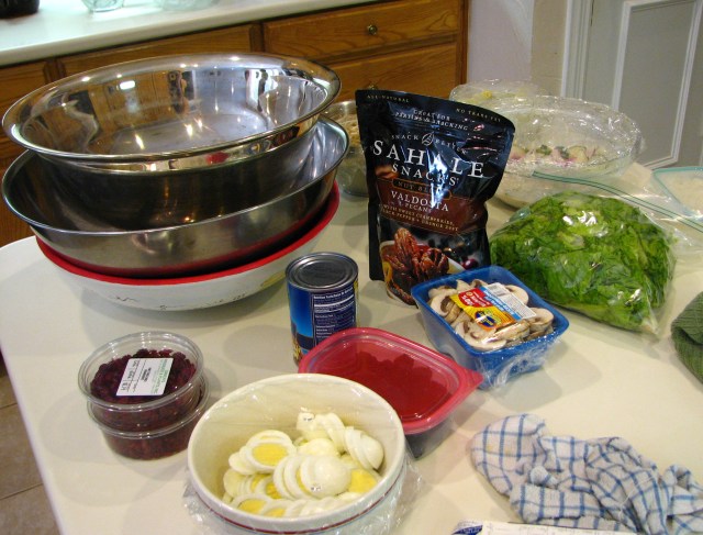 Nancy had big bowls in which to toss the ingredients when it was time for lunch. Lettuce, sugared pecans, cranberries, eggs, berries, mushrooms and maybe artichoke hearts in the can (?) had already arrived at this point. As well as a yummy cucumber salad in its own separate bowl. Nancy started with a “stone” and got lots of ingredients. What a fun idea!