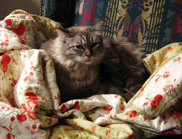 She learned to appreciate quilts even while she was living in the motorhome.  And she claims them as hers, just as any good cat would.