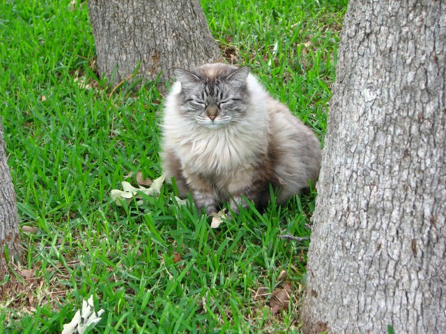 Miss Kitty is really Dear Hubby’s kitty.  He affectionately calls her “Missy.”  She arrived with him when he returned from Tulsa where he had been working for 14 months.  He told me he wasn’t going to bring her home with him.  But they had bonded and I wasn’t surprised to see her when he pulled in the driveway in our big motorhome.  She’s been here for just over a year now.  And one of these days she’s going to like me.  I’ve been working on her.  For some reason she just doesn’t understand what a big huge cat lover I am.  And even though I give her treats, she’s still not sure she likes me.  But she is the “other woman” after all.  Or maybe it’s me who is the other woman.  At least in her little cat head.  She has the biggest purr you’ve ever heard in your life.  Her whole body gets involved in purring.
