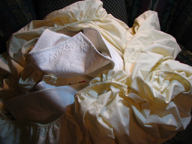 That quilt had to live inside a big fitted sheet as I worked on it. With only the small amount necessary peeking out as I stitched. Here’s why: