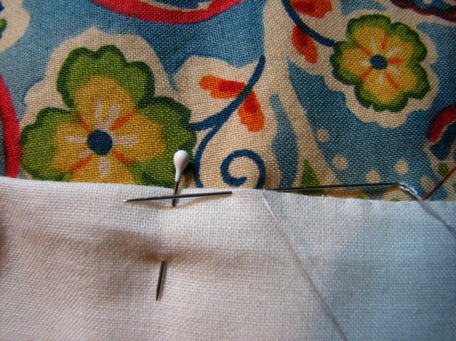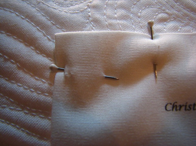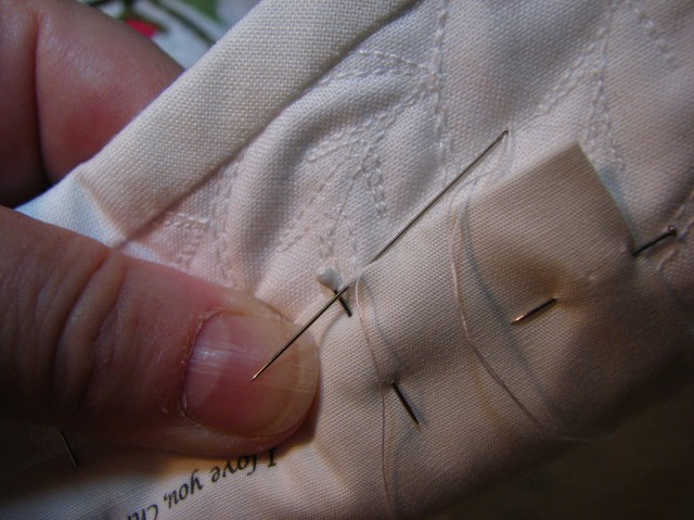 Remember the beautiful appliquè quilt of Susan’s I showed you recently? Here is the label ready to be stitched. Susan has been very sick. She probably wouldn’t have any quilts in the show if she’d had to finish them all. She’s got a big wedding coming up soon – her daughter’s. She needs to concentrate on getting well for that and not on finishing quilts. I was happy to help her out. And I enjoyed every stitch.