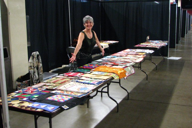 Pam shows off all the beautiful Silent Auction quilts.  Ready for judging.