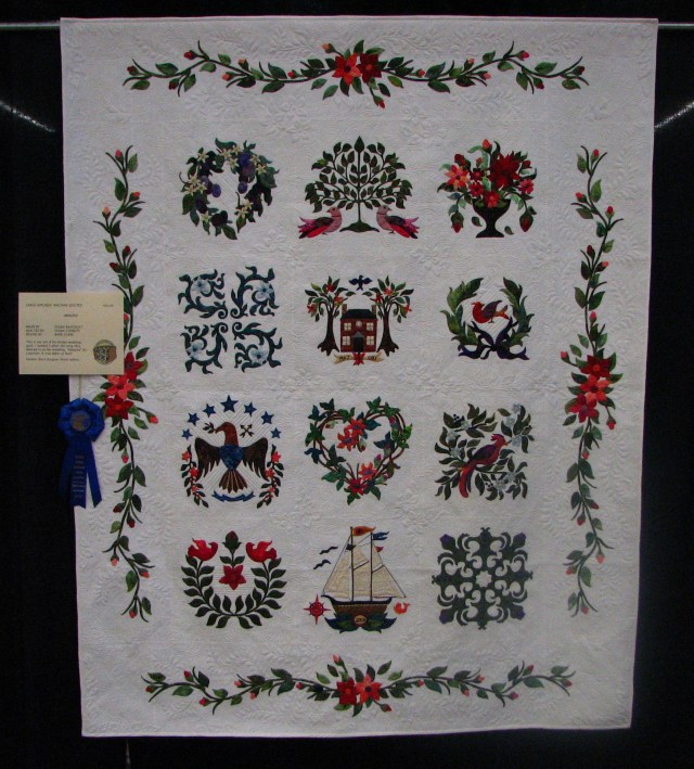 My friend Susan’s Beautiful Baltimore Album quilt she named “Amazed.”  If I’d made that quilt, I’d name it “Amazed I Finished It!”  Notice the Blue Ribbon for First Place in the appliquè category!