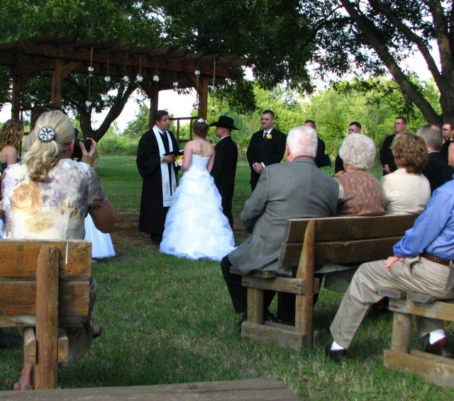 ………to meet her Groom who was wearing his cowboy hat.  And they stood in the shade of huge trees.  And exchanged their vows and rings and were pronounced Husband and Wife.