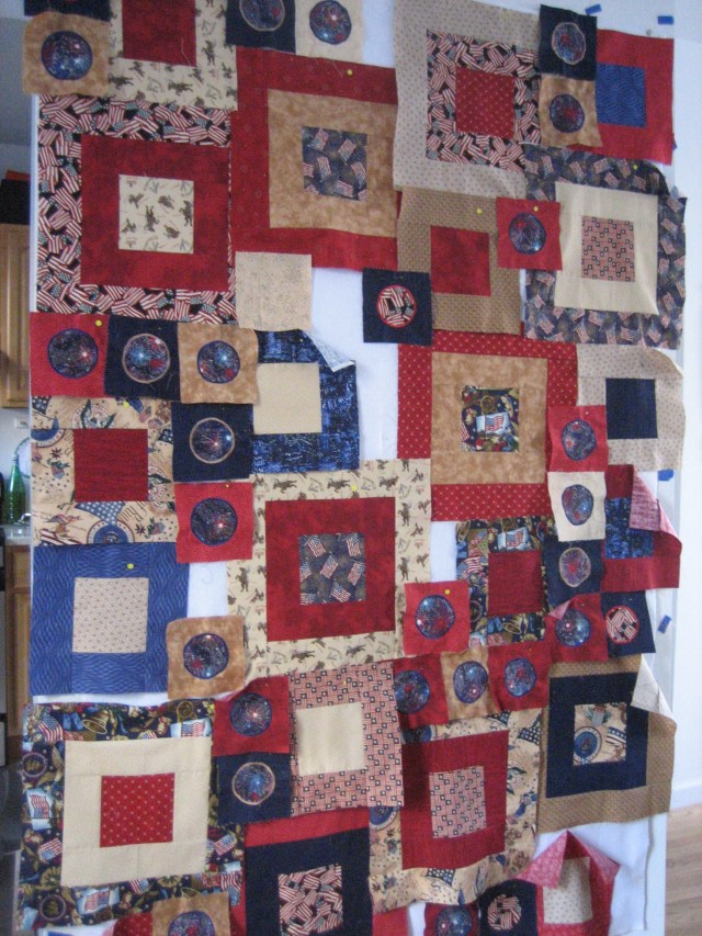 Surprise!  This is a show ‘n tell work in progress from Lani.  She wasn’t even at the Bee but she heard there were going to be show ‘n tell pics on my blog and she sent along a few pics I could share with you.  She’s making two patriotic quilts and this is one of them.
