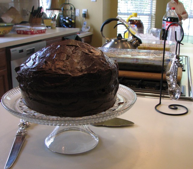 And this chocolate cake was sitting in the kitchen waiting for lunch.  Lunch is in the pans behind the cake, but my camera couldn’t focus on anything but the chocolate.  And I’m surprised you can’t see my drool.