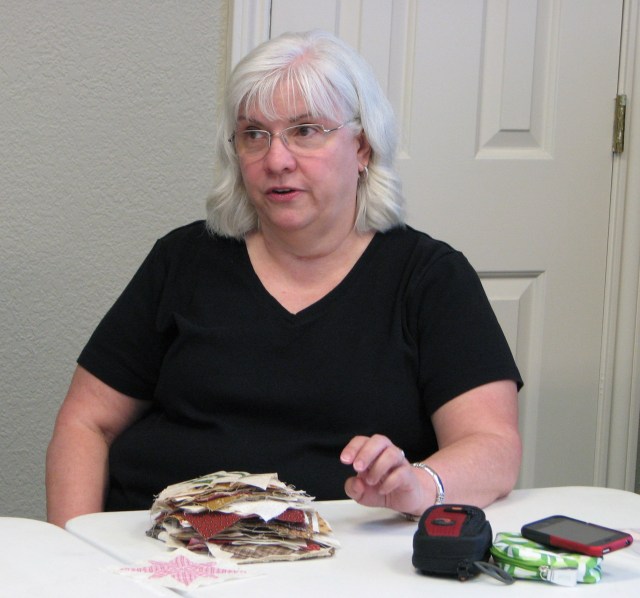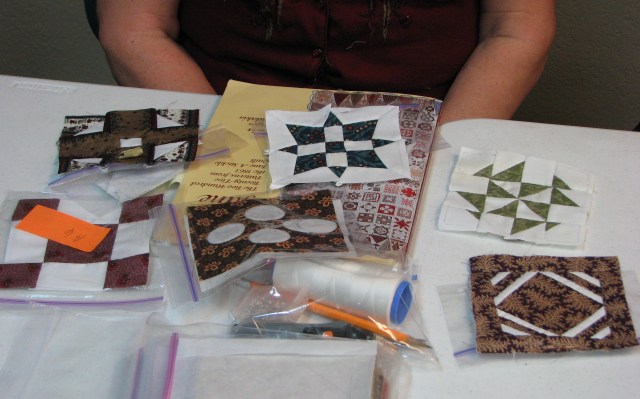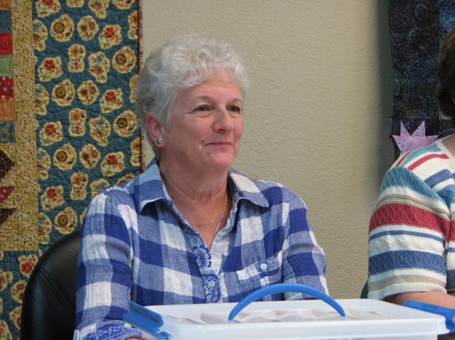 Denise forgot to bring all her blocks along and only has the one she is working on – and holding in her hand.   She is moving along well in her Dear Jane Journey.